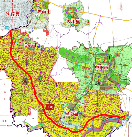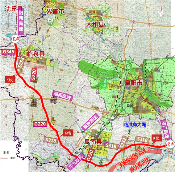 合肥至周口高速公路潁上(南照)至臨泉(皖豫省界)段是安徽省規(guī)劃的“五縱九橫”高速公路網(wǎng)的重要組成部分;其中,潁上(南照)至阜南段是“縱三”聯(lián)絡(luò)線的一段,阜南至臨泉(皖豫省界)段是“縱五”的一段。