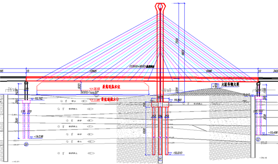 項(xiàng)目與谷河(定級(jí)VI級(jí)航道)交叉,綜合分析橋位處地形、地質(zhì)及地貌特點(diǎn),充分論證地形、地質(zhì)及全壽命周期安全性、經(jīng)濟(jì)性、合理性、景觀性等方面綜合考慮選用相應(yīng)的橋型方案。本項(xiàng)目跨越谷河特大橋采用130+95m獨(dú)塔斜拉橋方案,橋梁造型與所在區(qū)域的王家壩精神相呼應(yīng)。
