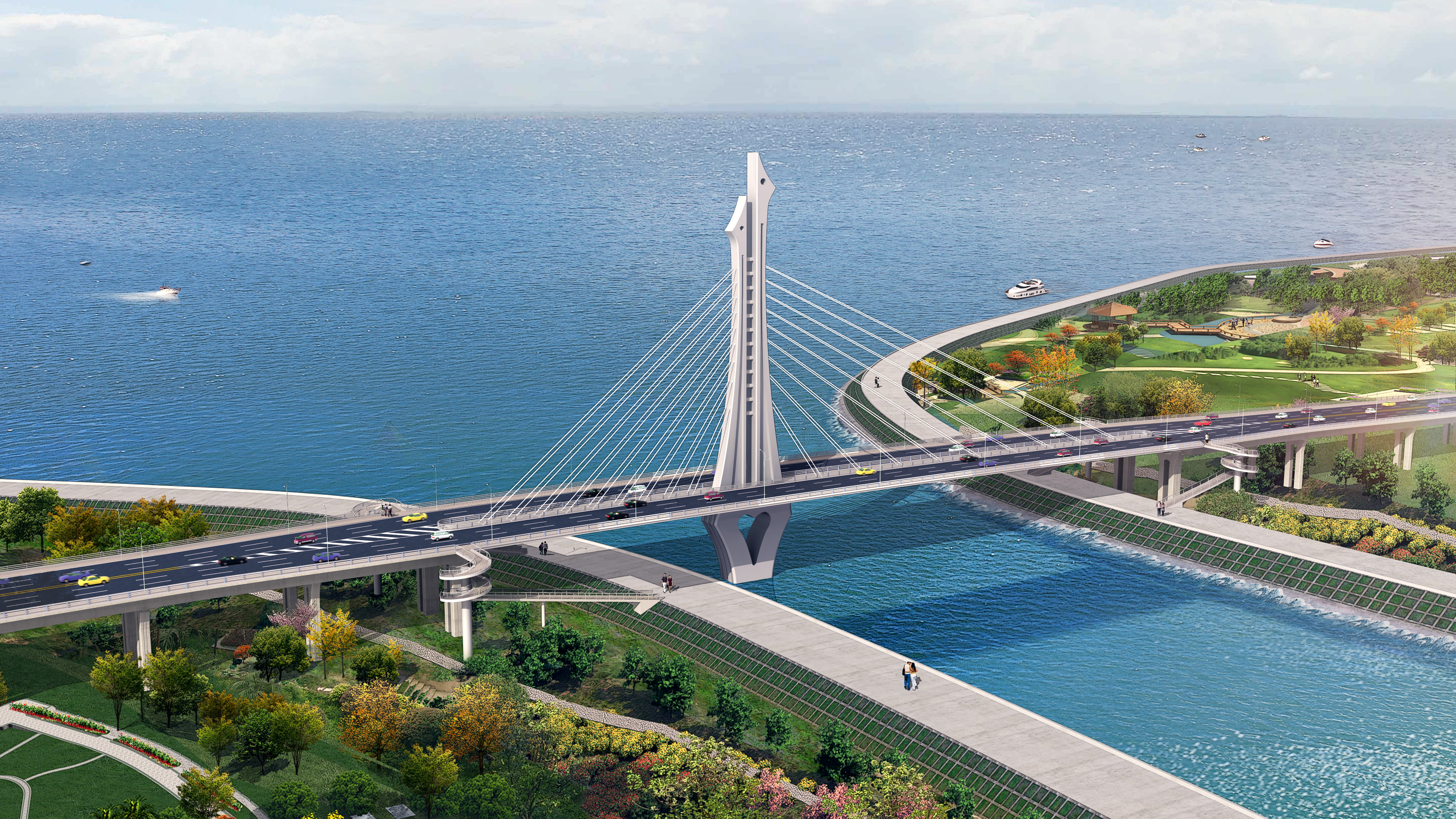 橋梁好似一只從河面上騰飛而起的大雁。寓意巢湖在融入新合肥后,環(huán)巢湖區(qū)域展翅高飛,迎接新的航程。