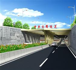 中央公園下穿隧道位于安徽省淮南市山南新區(qū),為市政下穿隧道,雙向四車道,采用單箱雙孔結(jié)構(gòu),穿越中央公園人工湖。隧道引道側(cè)壁采用體現(xiàn)當(dāng)?shù)氐赜蛭幕母〉裱b飾,隧道暗洞洞口結(jié)合洞頂綠化,設(shè)置景觀藝術(shù)小品,實現(xiàn)結(jié)構(gòu)物與洞外景觀的和諧統(tǒng)一。
