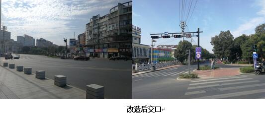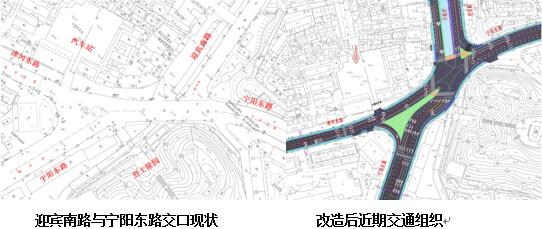 4)K型交口改造方案。迎賓路、寧陽(yáng)路交口為異形交叉口,受道路周邊建筑物所限,設(shè)計(jì)提出十字型交口、分段燈控交口兩種設(shè)計(jì)方案,對(duì)交口交通流進(jìn)行渠化改造,實(shí)施后區(qū)域交通得到極大改善。