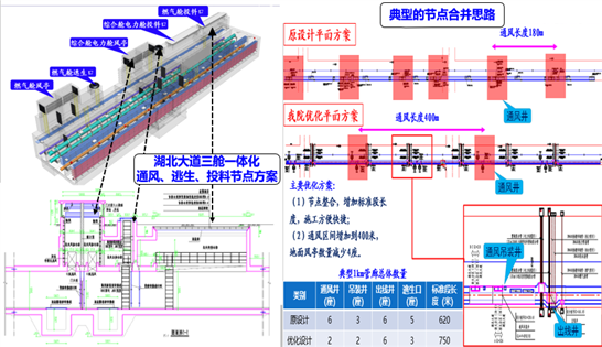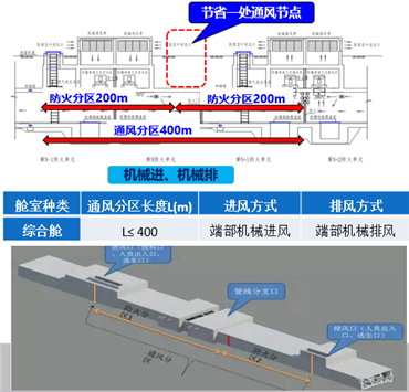 采用節(jié)點(diǎn)一體化整合設(shè)計(jì)思路,合并設(shè)置通風(fēng)、進(jìn)出線、吊裝、逃生等節(jié)點(diǎn),增加連續(xù)管廊標(biāo)準(zhǔn)段長(zhǎng)度,便于施工。