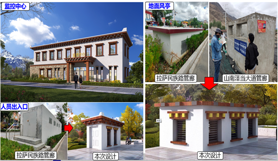 監(jiān)控中心建筑采用傳統(tǒng)的藏式建筑風(fēng)格來進(jìn)行立面設(shè)計(jì),立面增加斗拱、八蘇等元素,帶有樸素的藏式風(fēng)格。其他人員出入口、地上風(fēng)亭風(fēng)格與其統(tǒng)一。