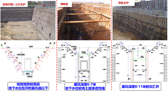 本場(chǎng)地地下水類型主要為第四系孔隙水,對(duì)本工程施工影響較大。第四系孔隙水主要儲(chǔ)藏于第四系沖洪積卵石層中,其滲透性較強(qiáng),水量較豐富,水位受季節(jié)變化影響較大。針對(duì)不同區(qū)域具體情況采取不同防護(hù)措施。